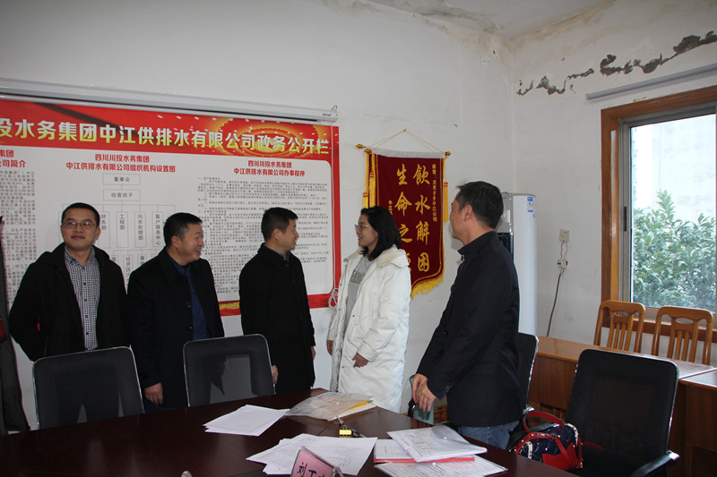 在公司會議室,陳勇副縣長與川投水務(wù)集團黨委副書記、工會主席、中江水司董事長王小元進行了親切交流,并感謝中江水司在過去一年里為中江經(jīng)濟社會發(fā)展,尤其是環(huán)保督察、污水項目建設(shè)以及脫貧攻堅工作所作出的努力!同時,陳勇副縣長查看了管網(wǎng)水質(zhì)、水壓在線監(jiān)測系統(tǒng),并希望切實做好春節(jié)期間安全生產(chǎn)和供水應(yīng)急保障預(yù)案,履職盡責(zé),確保節(jié)日期間安全供水,并借此機會恭祝大家新年快樂!