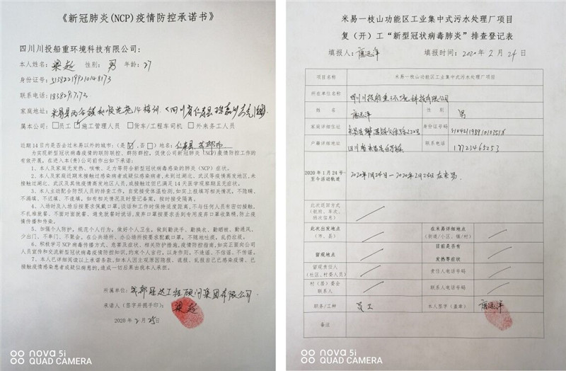 四川川投船重環(huán)境科技有限公司為堅(jiān)決打贏新冠肺炎NCP疫情防控阻擊戰(zhàn),早日實(shí)現(xiàn)項(xiàng)目復(fù)工,按照屬地管理要求,毫不松懈地抓好春節(jié)期間及節(jié)后公司、施工單位人員疫情防控工作,提前謀劃和部署公司及項(xiàng)目現(xiàn)場(chǎng)在NCP疫情期間的防控管理工作及施工組織方案、措施和應(yīng)急預(yù)案。做好防疫情,抓復(fù)工,盯安全,重施工,合理有序組織復(fù)工及防疫工作。經(jīng)米易縣政府組織有關(guān)部門對(duì)施工現(xiàn)場(chǎng)防疫措施及防疫物資準(zhǔn)備等工作的現(xiàn)場(chǎng)核查,達(dá)到復(fù)工標(biāo)準(zhǔn)。在2020年2月28日取得米易縣首批建筑施工項(xiàng)目復(fù)(開)工批準(zhǔn)令后復(fù)工(米易住建局編號(hào)014號(hào)《恢復(fù)施工通知書》),目前正按縣政府關(guān)于復(fù)工相關(guān)要求,全力組織施工單位人員持健康證明等手續(xù)陸續(xù)進(jìn)場(chǎng)。