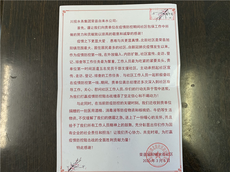 急群眾之所急,想群眾之所想。這一面錦旗和一封感謝信不僅代表著北街社區(qū)對公司所做工作的充分肯定和認可,更彰顯了作為供水企業(yè)的社會責任和擔當,樹立了良好的社會形象。疫情當前,榮縣水司定當會繼續(xù)落實疫情防控工作和生產(chǎn)經(jīng)營工作舉措,同心協(xié)力、共克時艱,全力做好疫情防控和安全穩(wěn)定供水工作!