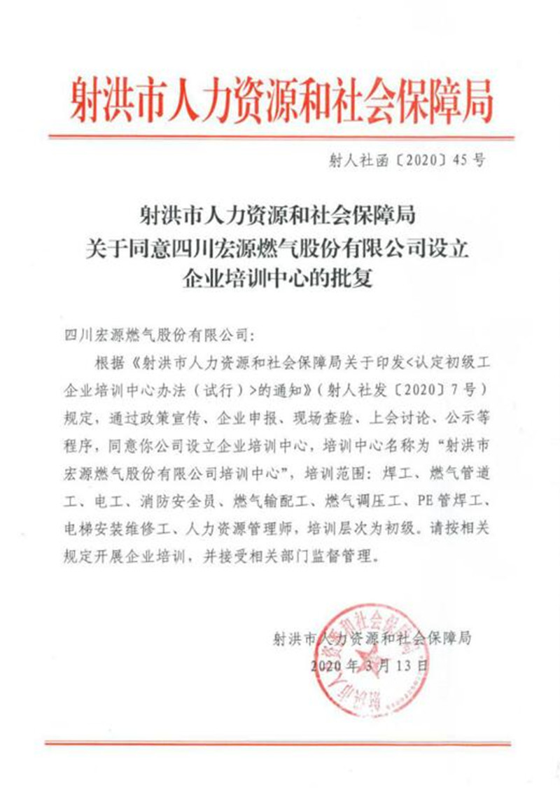 為積極響應(yīng)射洪市職業(yè)技能提升行動(dòng),搭建優(yōu)質(zhì)的企業(yè)職工技能培訓(xùn)平臺(tái),經(jīng)公司主動(dòng)申報(bào),在射洪市人力資源和社會(huì)保障局和就業(yè)服務(wù)管理局的現(xiàn)場(chǎng)核查和悉心指導(dǎo)下,2020年3月13日宏源公司被批準(zhǔn)設(shè)立企業(yè)培訓(xùn)中心。宏源公司培訓(xùn)中心的成功創(chuàng)建,意味著公司將可以面向社會(huì)開展“焊工、燃?xì)夤艿拦?、電工、消防安全員、燃?xì)廨斉涔?、燃?xì)庹{(diào)壓工、PE管焊工、電梯安裝維修工、人力資源管理師”等9個(gè)專業(yè)技術(shù)工種的初級(jí)培訓(xùn)取證工作,也勢(shì)必為射洪市增強(qiáng)就業(yè)能力、在職員工崗位職業(yè)穩(wěn)定,企業(yè)安全生產(chǎn)、可持續(xù)發(fā)展提供堅(jiān)強(qiáng)保障。