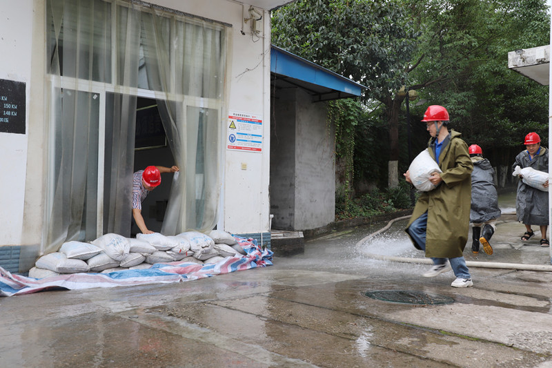 隨后,模擬在天氣突然強(qiáng)降雨的情況下,接到險情報告后,按照演練方案立即啟動防洪、防汛、防澇應(yīng)急預(yù)案。值班人員發(fā)現(xiàn)險情后,立即向部門負(fù)責(zé)人報告,參演人員迅速領(lǐng)取防汛器具并用沙袋進(jìn)行防護(hù),阻擋洪水進(jìn)入泵房。