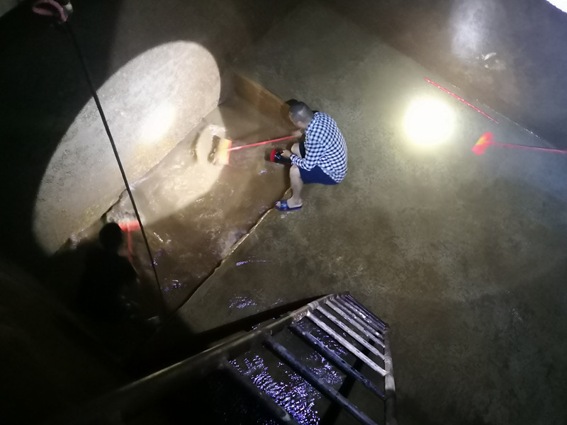 清洗隊員由水廠負責人李明遠親自帶隊,從清水池進水口向出水口有序推進,埋頭苦干的員工,分不清額頭上是汗水還是水漬,僅聽見笤帚清洗的水聲在清水池四壁回響,水中的沉積物也在一行人的清洗中越來越少,身后流入的潺潺細流也變得清冽無比,在燈光照耀下粼粼泛光。