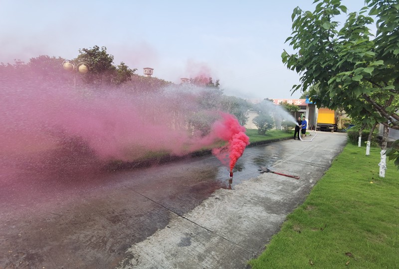 搶險人員分為兩組同時進(jìn)行搶險,第一組搶險人員穿好耐酸堿防護(hù)服,戴好防毒面具,進(jìn)入加藥車間切斷二氧化氯機(jī)電源,打開通風(fēng)設(shè)備和尋找泄漏點(diǎn);第二組搶險人員為防止二氧化氯氣體大面積擴(kuò)散,站在上風(fēng)口利用高壓水槍對泄露的二氧化氯氣體進(jìn)行稀釋,并準(zhǔn)備好干粉滅火器防止設(shè)備因線路故障導(dǎo)致自燃。整個演練過程嚴(yán)謹(jǐn)、有序,各應(yīng)急隊(duì)伍協(xié)調(diào)配合,有條不紊。