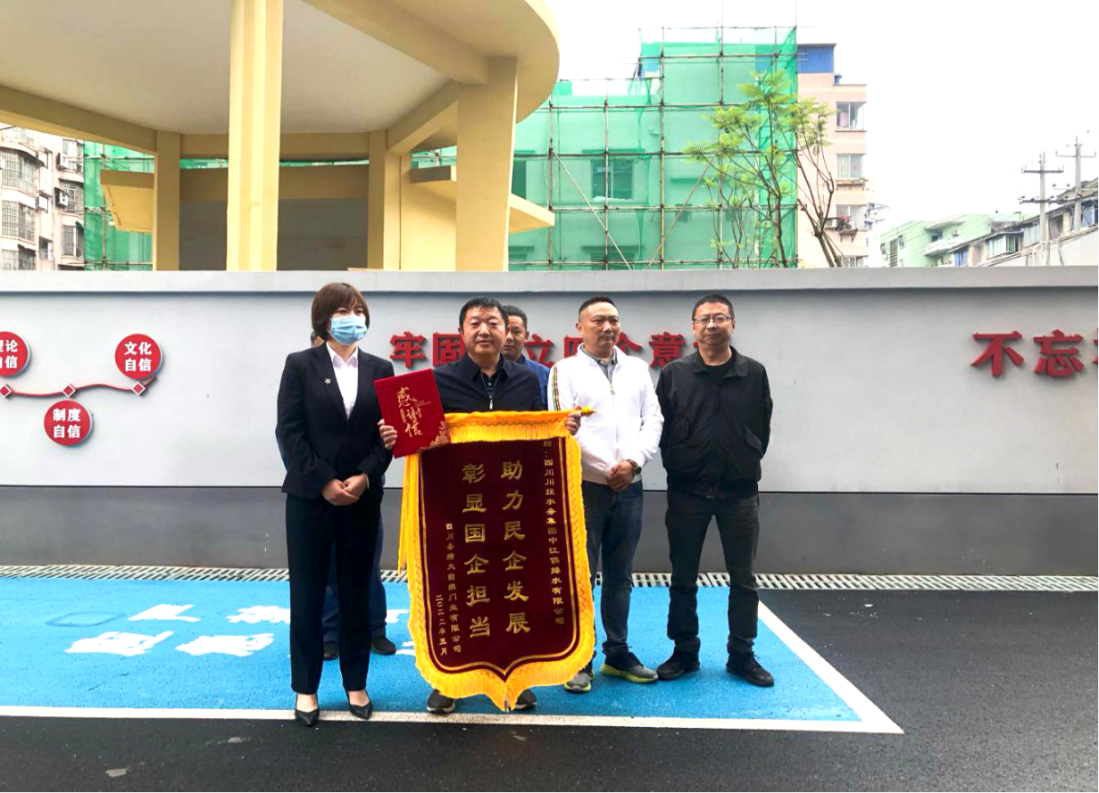 5月18日下午,四川圣締大自然門業(yè)有限公司來到中江水司,將一封感謝信和一面印有“助力民企發(fā)展 彰顯國企擔當”的錦旗送到黨支部書記、董事長、總經(jīng)理朱禹手中,以表達對中江水司解決其用水困難的高度贊揚和誠摯謝意。