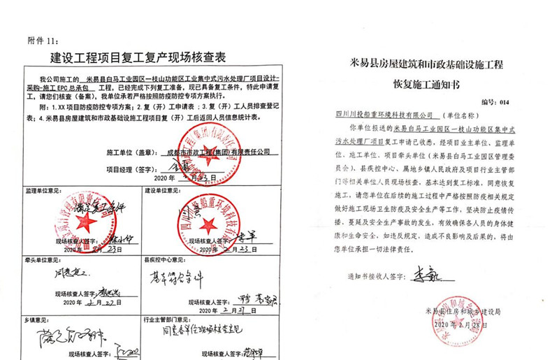 四川川投船重環(huán)境科技有限公司為堅(jiān)決打贏新冠肺炎NCP疫情防控阻擊戰(zhàn),早日實(shí)現(xiàn)項(xiàng)目復(fù)工,按照屬地管理要求,毫不松懈地抓好春節(jié)期間及節(jié)后公司、施工單位人員疫情防控工作,提前謀劃和部署公司及項(xiàng)目現(xiàn)場(chǎng)在NCP疫情期間的防控管理工作及施工組織方案、措施和應(yīng)急預(yù)案。做好防疫情,抓復(fù)工,盯安全,重施工,合理有序組織復(fù)工及防疫工作。經(jīng)米易縣政府組織有關(guān)部門(mén)對(duì)施工現(xiàn)場(chǎng)防疫措施及防疫物資準(zhǔn)備等工作的現(xiàn)場(chǎng)核查,達(dá)到復(fù)工標(biāo)準(zhǔn)。在2020年2月28日取得米易縣首批建筑施工項(xiàng)目復(fù)(開(kāi))工批準(zhǔn)令后復(fù)工(米易住建局編號(hào)014號(hào)《恢復(fù)施工通知書(shū)》),目前正按縣政府關(guān)于復(fù)工相關(guān)要求,全力組織施工單位人員持健康證明等手續(xù)陸續(xù)進(jìn)場(chǎng)。