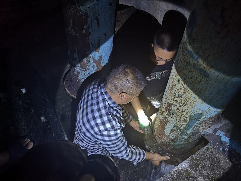 清洗隊(duì)員由水廠負(fù)責(zé)人李明遠(yuǎn)親自帶隊(duì),從清水池進(jìn)水口向出水口有序推進(jìn),埋頭苦干的員工,分不清額頭上是汗水還是水漬,僅聽見笤帚清洗的水聲在清水池四壁回響,水中的沉積物也在一行人的清洗中越來越少,身后流入的潺潺細(xì)流也變得清冽無比,在燈光照耀下粼粼泛光。