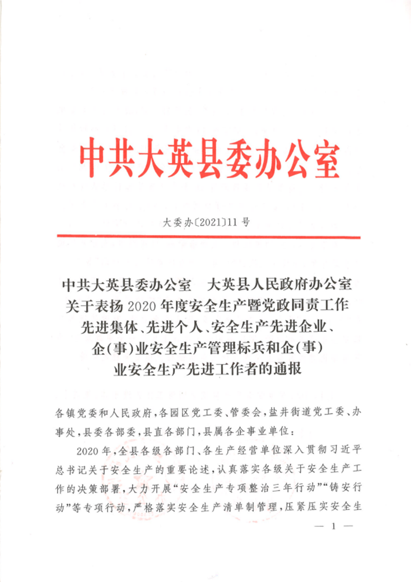 2月19日,大英縣召開安全生產(chǎn)工作會。會上,大英水司榮獲“安全生產(chǎn)先進企業(yè)”榮譽稱號。