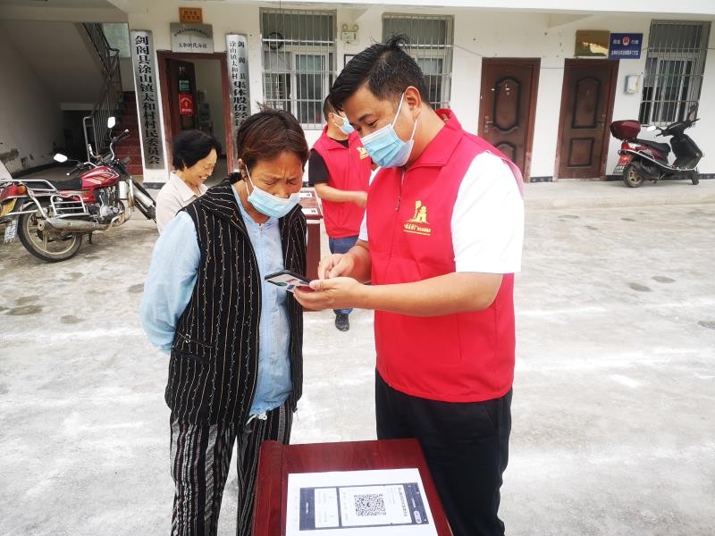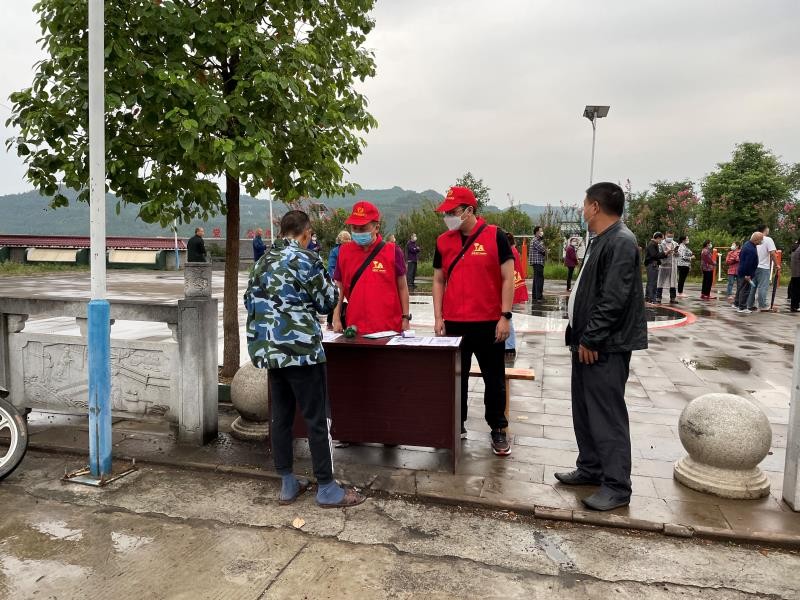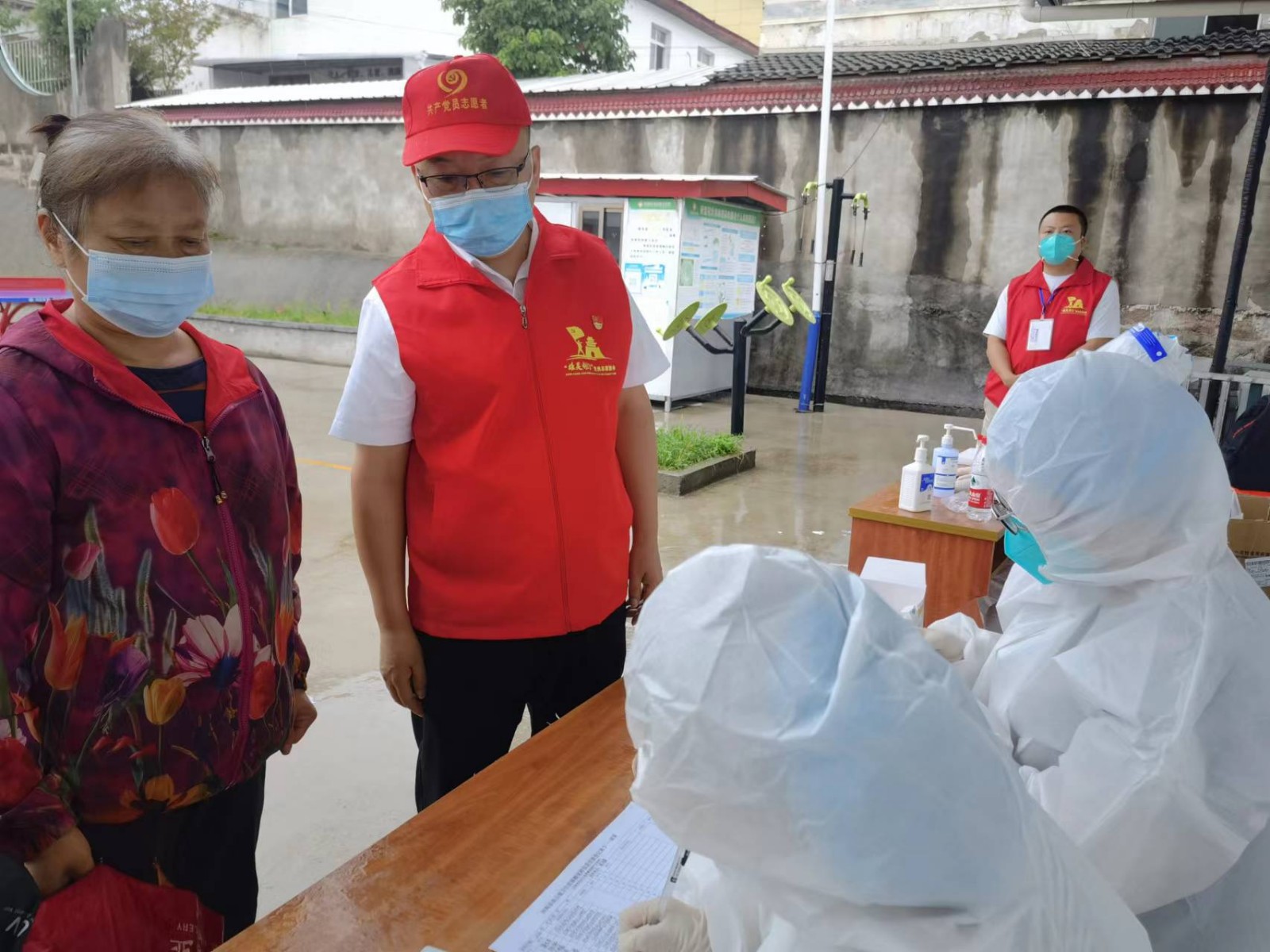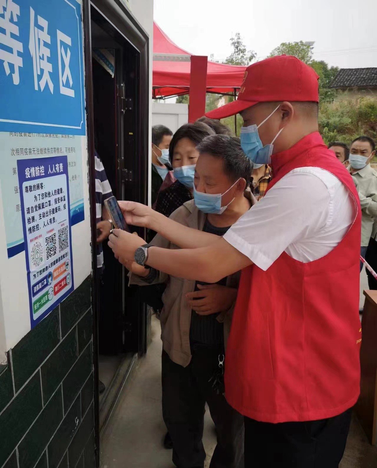 隨著人流量不斷增加,隊員們又主動承擔起維持秩序、引導掃碼測溫等工作?!罢埬鷰Ш每谡?,出示行程碼,掃場所碼!”由于農村地區(qū)老年人居多,對核酸檢測程序不了解,隊員們不厭其煩地一遍又一遍地重復著引導語。有的老年人沒有智能手機或者不會使用,他們又主動幫助其核實身份信息、綁定“天府健康通”APP等等,讓采樣過程更加流暢,效率大大提高。經(jīng)過一天的努力,涂山鎮(zhèn)全域全員核酸采樣完成,無一人漏檢。