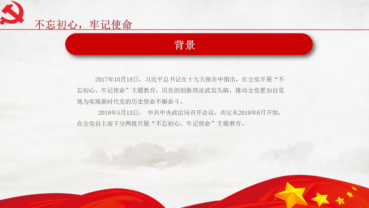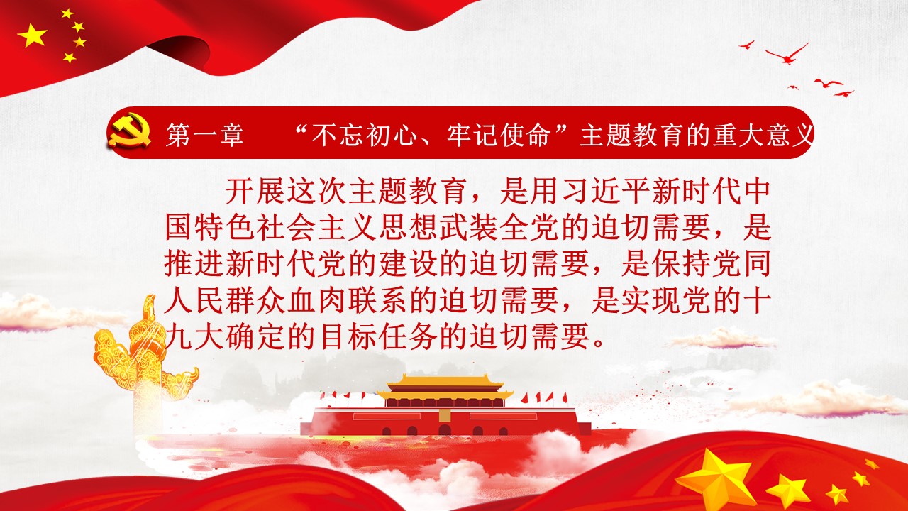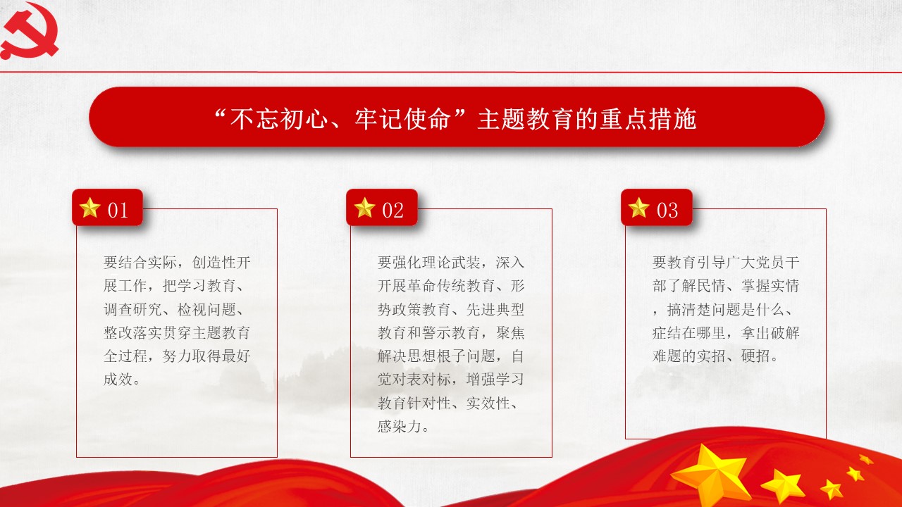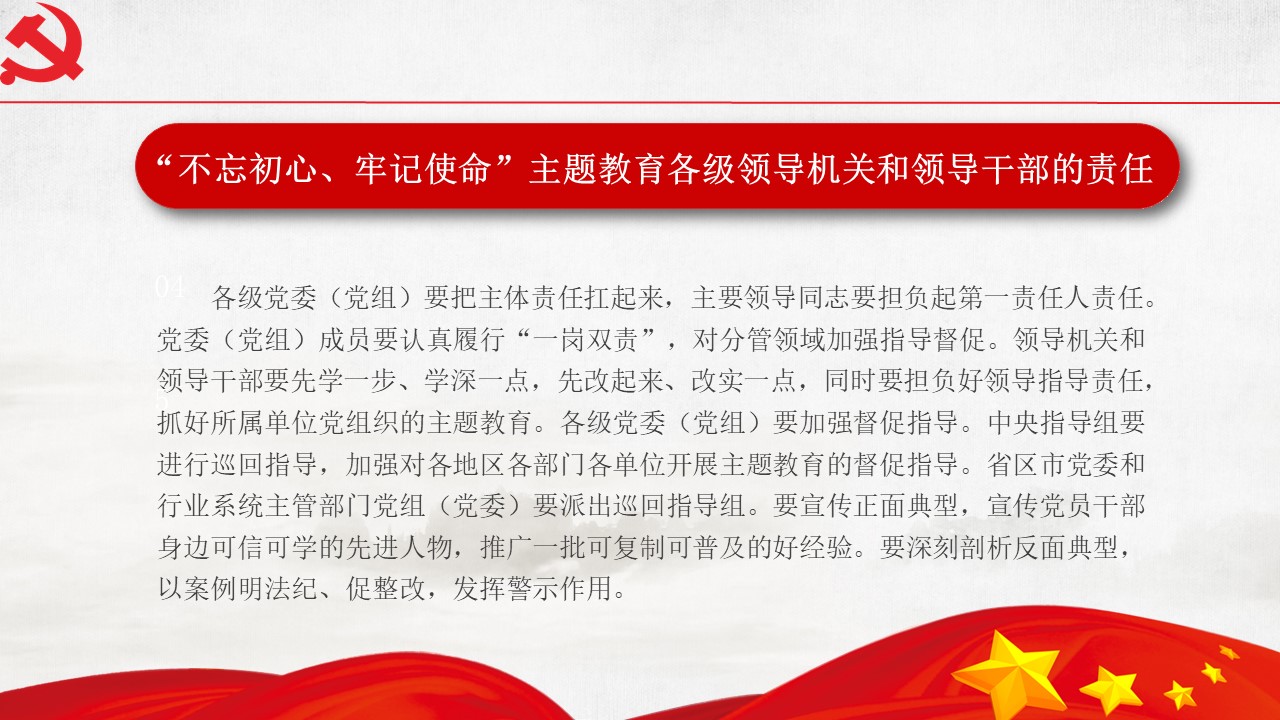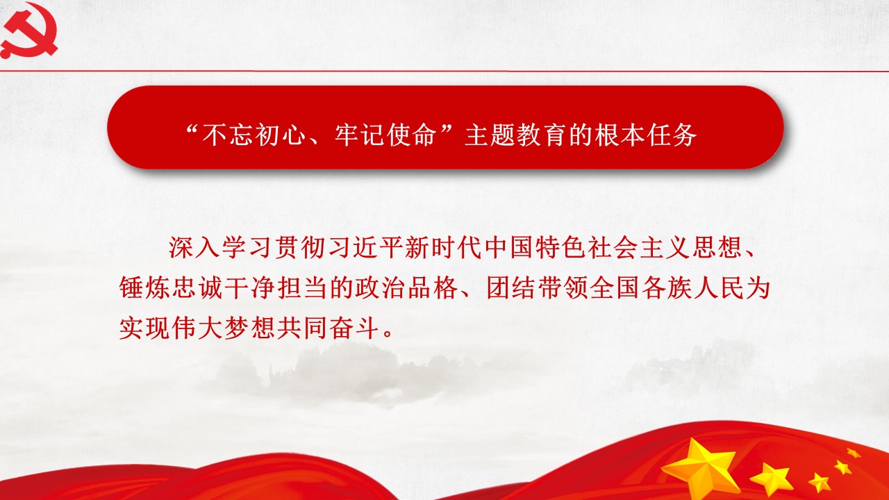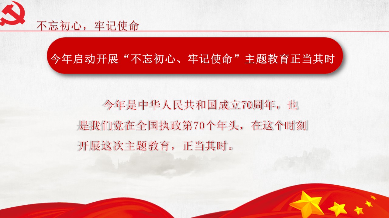 5月31日“不忘初心、牢記使命”主題教育工作會(huì)議31日在北京召開。中共中央總書記、國(guó)家主席、中央軍委主席習(xí)近平出席會(huì)議并發(fā)表重要講話。他強(qiáng)調(diào),為中國(guó)人民謀幸福,為中華民族謀復(fù)興,是中國(guó)共產(chǎn)黨人的初心和使命,是激勵(lì)一代代中國(guó)共產(chǎn)黨人前赴后繼、英勇奮斗的根本動(dòng)力。開展“不忘初心、牢記使命”主題教育,要牢牢把握守初心、擔(dān)使命,找差距、抓落實(shí)的總要求,牢牢把握深入學(xué)習(xí)貫徹新時(shí)代中國(guó)特色社會(huì)主義思想、...